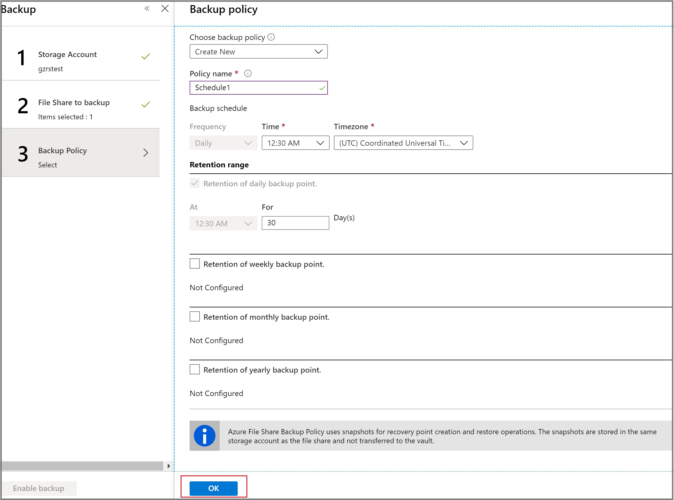 Configure Backup for Azure FileShare, selecting your storage accounts and shares.